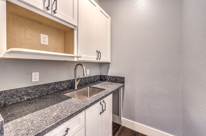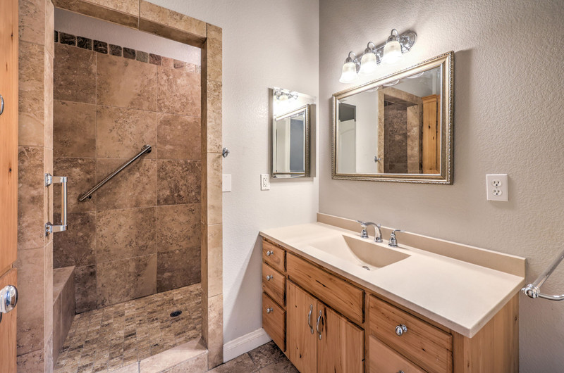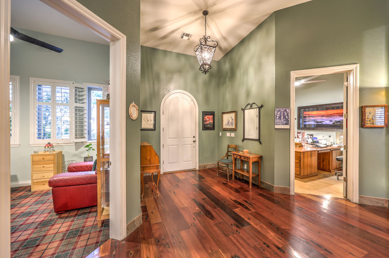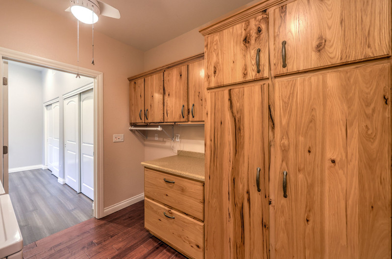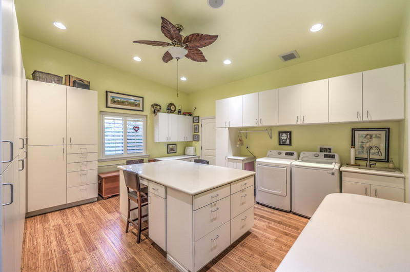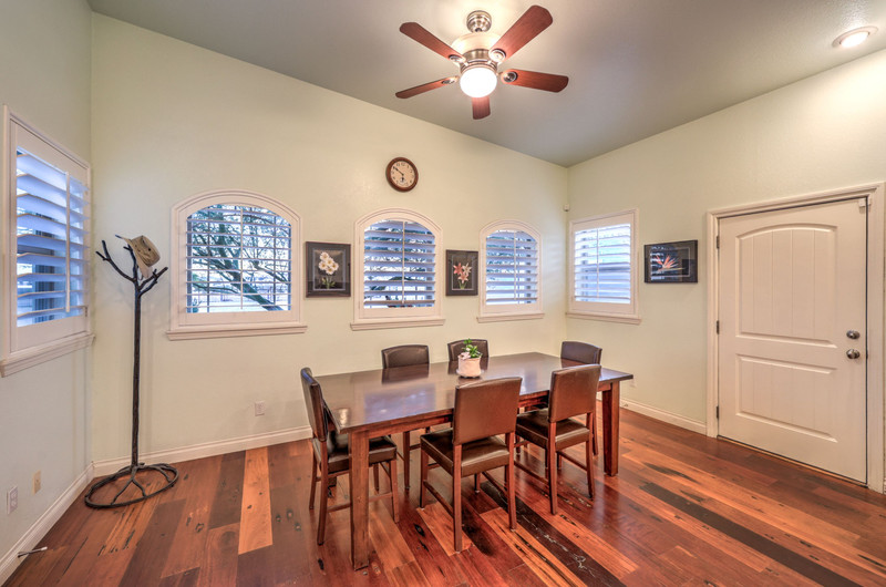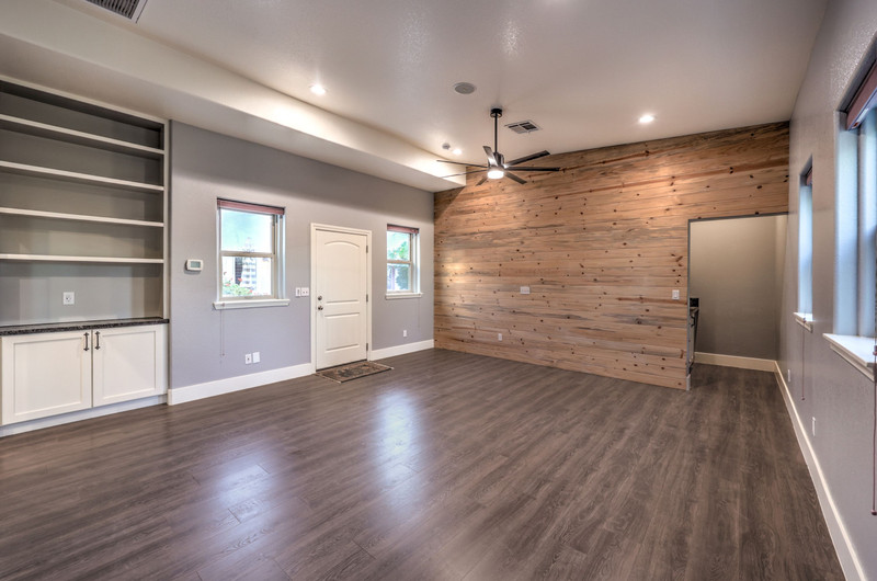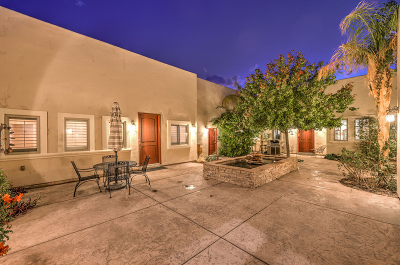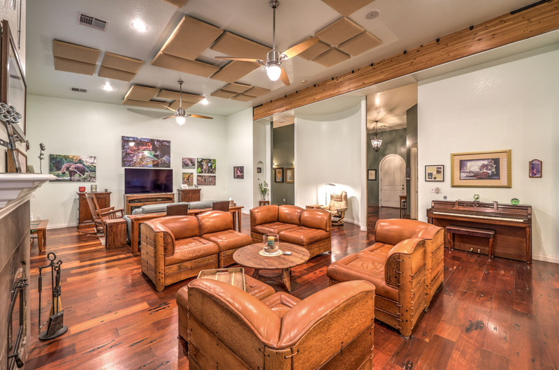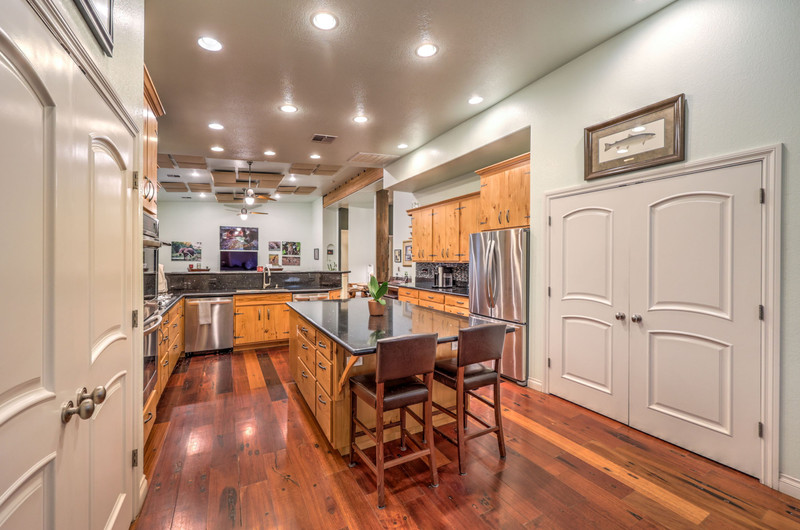 Enter through the charming courtyard with a tranquil water feature, where each living space enjoys its own private entrance. The main residence features an open-concept layout, vaulted ceilings, 100-year reclaimed hardwood floors, plantation shutters, and a wood-burning fireplace. The chef’s kitchen showcases rustic hickory cabinetry, quartz countertops, double ovens, two dishwashers, dual pantries, and a massive island with abundant storage and seating.