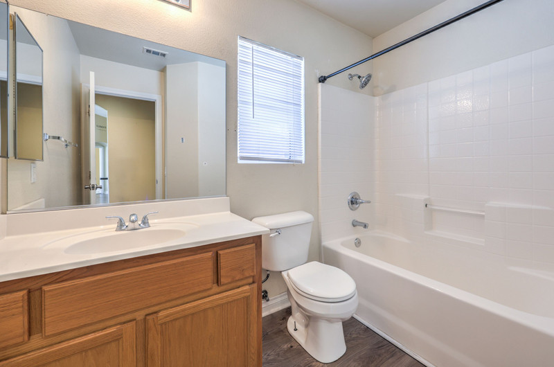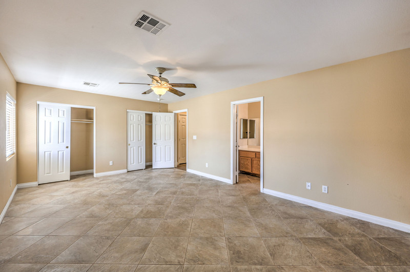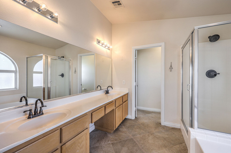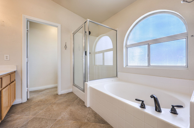 The primary suite includes vaulted ceilings, a large 16x14 layout with bay window and sliding door access to the backyard, and a walk-in closet. The en-suite bathroom features dual sinks, separate tub and shower, and tile flooring.