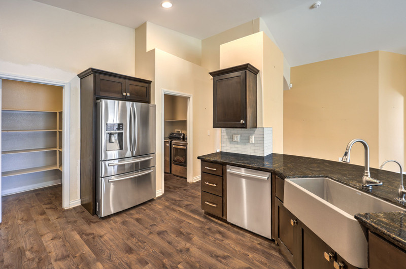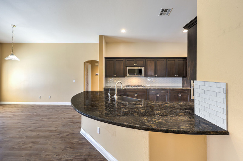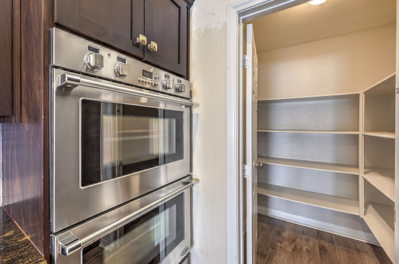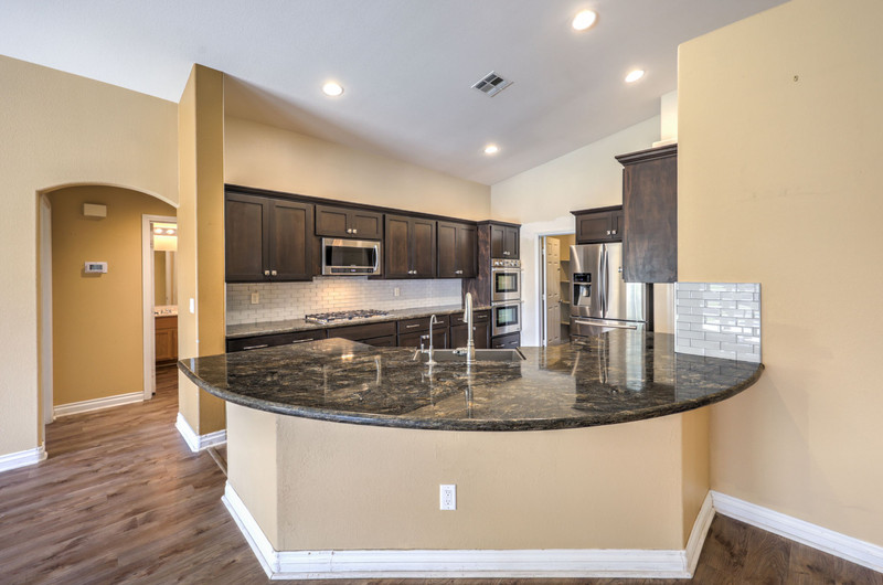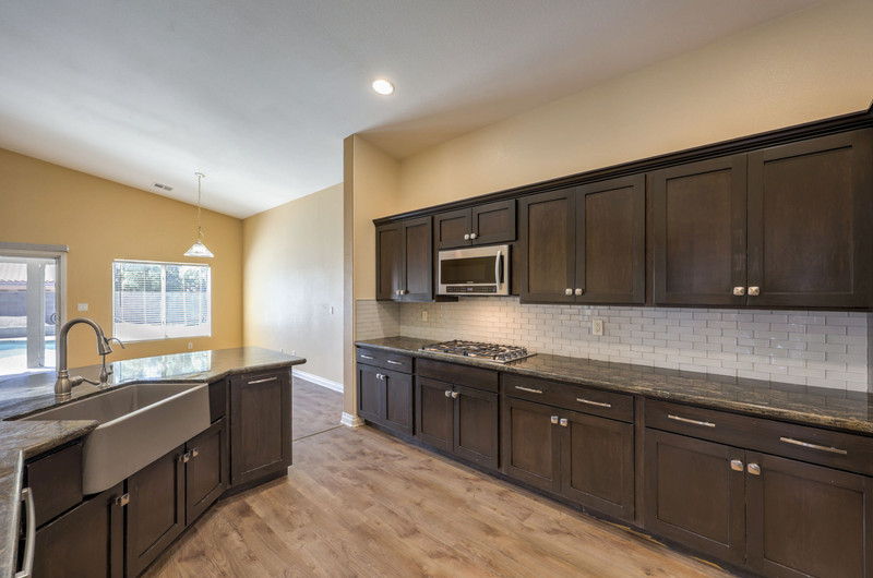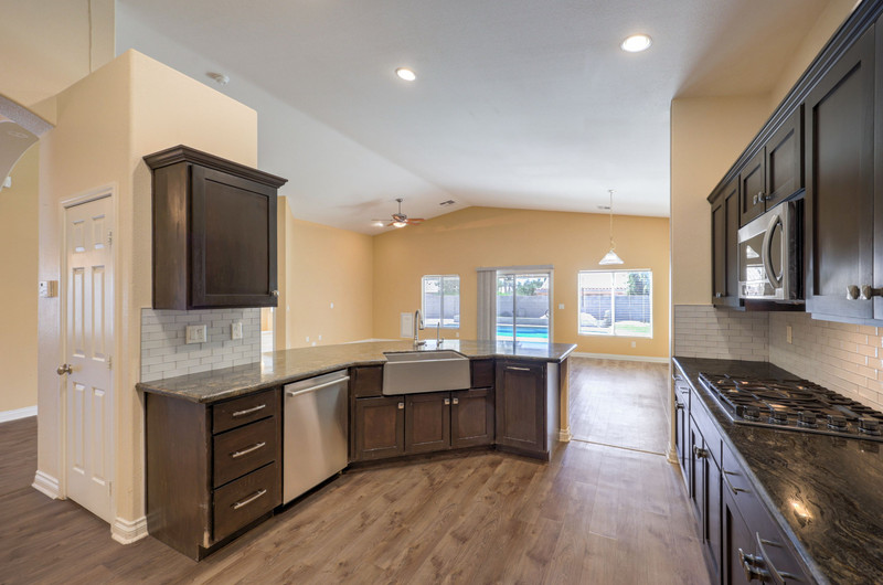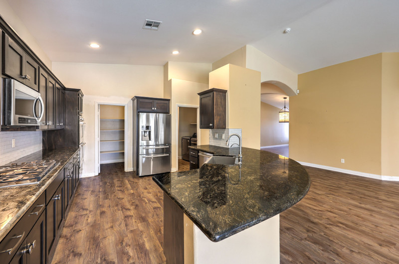 Inside, the family room features vaulted ceilings, a ceiling fan, and laminate wood flooring, creating an open and inviting atmosphere. The kitchen is well-appointed with stone countertops, stainless steel appliances, five-burner cooktop, built-in microwave, double ovens, tile backsplash, island with storage, recessed lighting, and a walk-in pantry. A built-in RO system and refrigerator with ice and water maker add convenience.