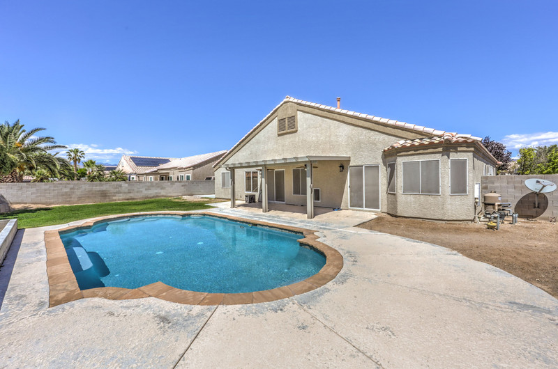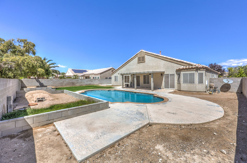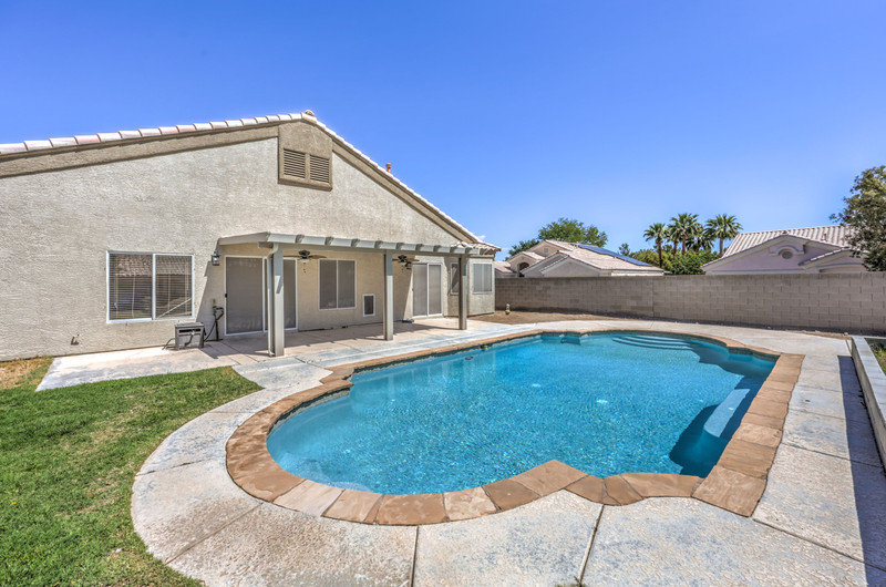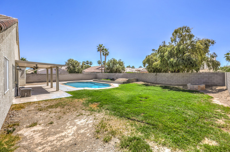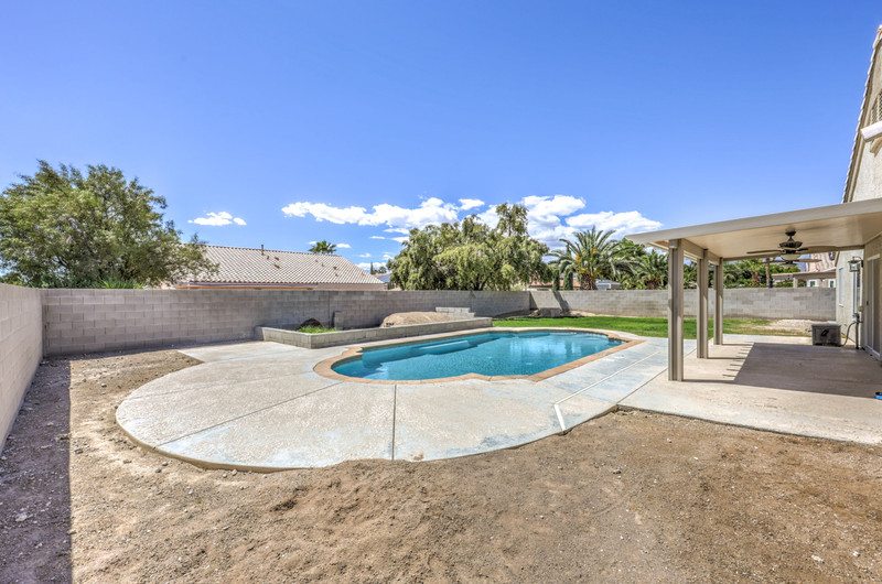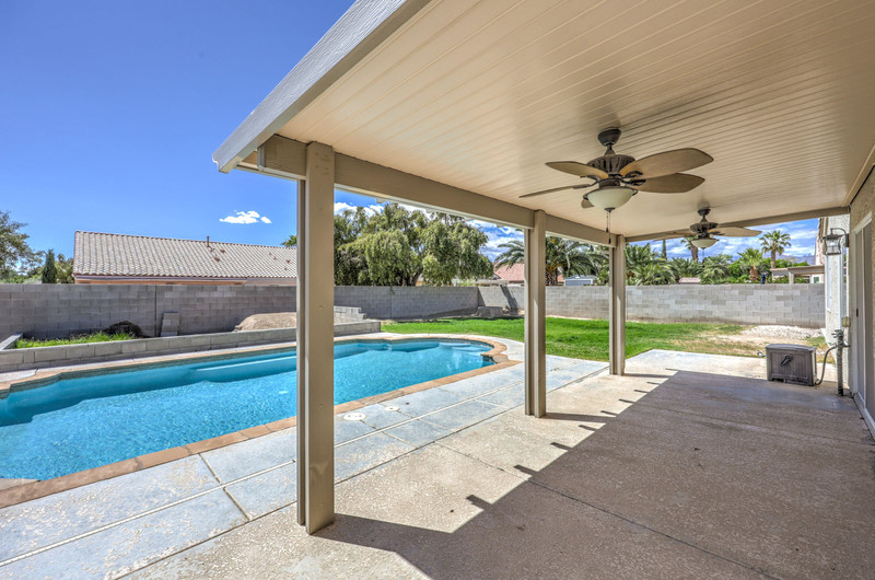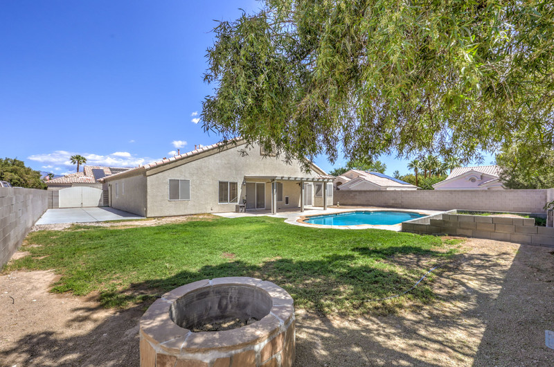 The backyard is designed for entertaining and relaxation, featuring a large swimming pool with, self-cleaning jet system, filtration and pump system, and an oxidizer for reduced chemical maintenance. A covered aluma wood patio with ceiling fans and exterior lighting extends the living space outdoors, along with a gas stub for future BBQ installation. The yard also includes a grass area with a fire pit, creating multiple gathering spaces.