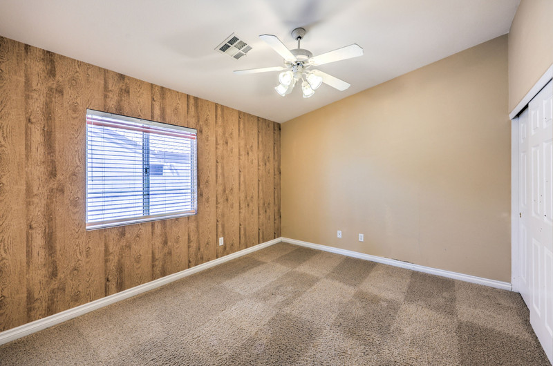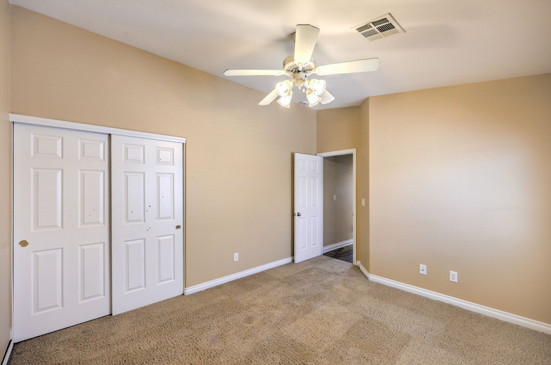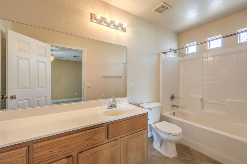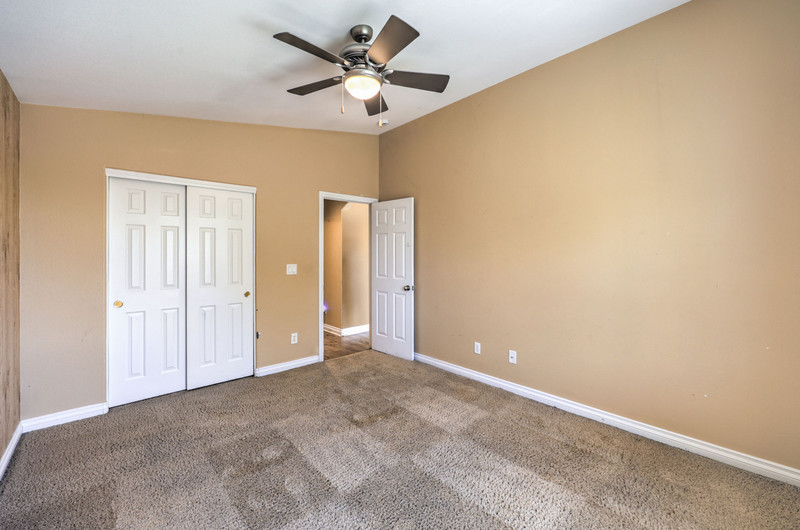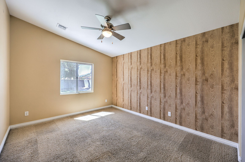 Additional bedrooms are thoughtfully separated for privacy. One guest bedroom includes its own en-suite bath with tub/shower combo, tile flooring, and ceiling fan. Bedrooms three and four are well-sized (13x11 and 12x11), each with ceiling fans, vaulted ceilings or upgraded volume ceilings, and pre-wiring for cable and phone. Flooring in these secondary bedrooms is carpet.