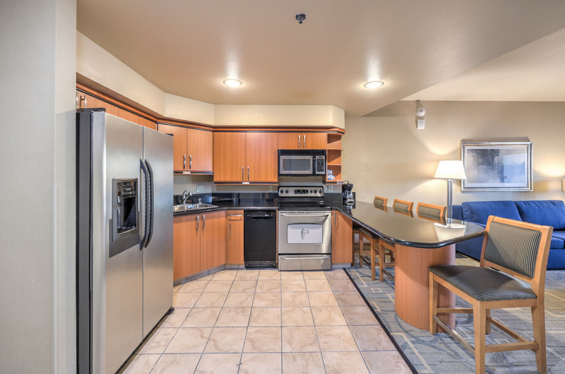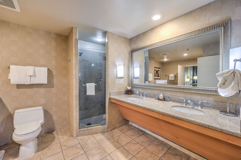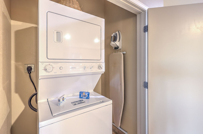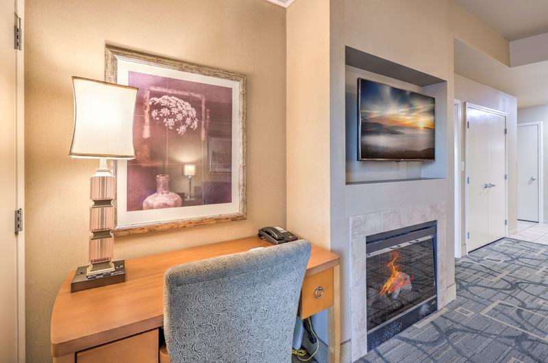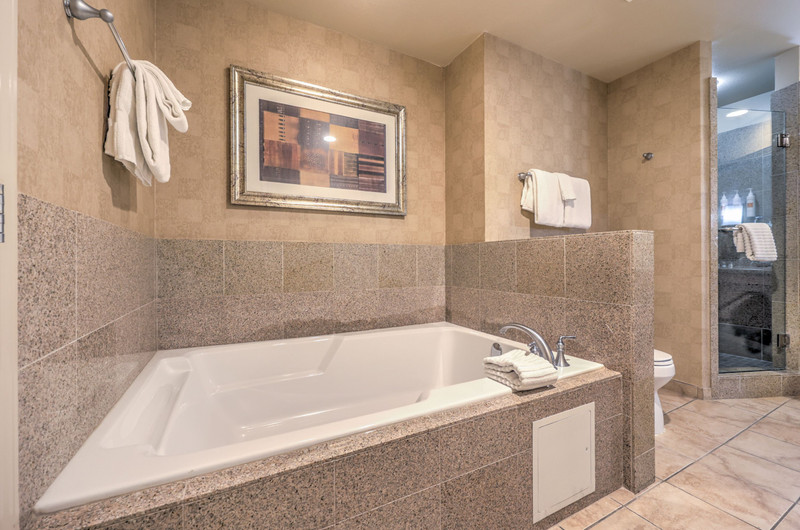 This unit boasts some breathtaking views of the mountains and cityscape. The unit is fully furnished with a couch bed for two and a King-sized bed in the bedroom, an extra-large Roman-style tub, a separate shower, 2 sinks, a Full refrigerator, a microwave, a stove, an in-room safe, a Bose audio system, and a private balcony. Unlike most of the other units, this unit also has a stackable washer and dryer, and a gas Fireplace.