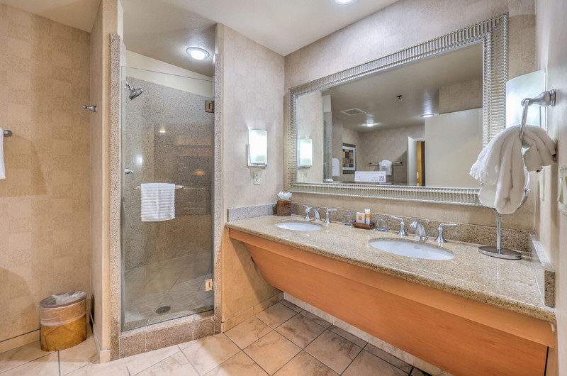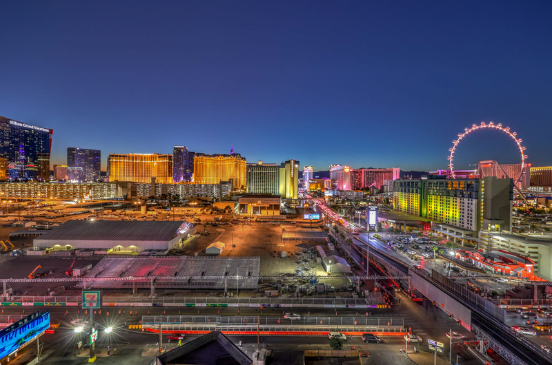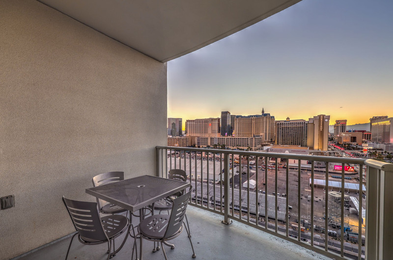 This unit boasts some of the best views the building has to offer, which include the Las Vegas Strip and views of F1 Racing. The unit is fully furnished with a couch bed for two and a King-sized bed in the bedroom, an extra-large Roman-style tub, a separate shower, 2 sinks, a Full refrigerator, a microwave, a stove, an in-room safe, a Bose audio system, and a private balcony.